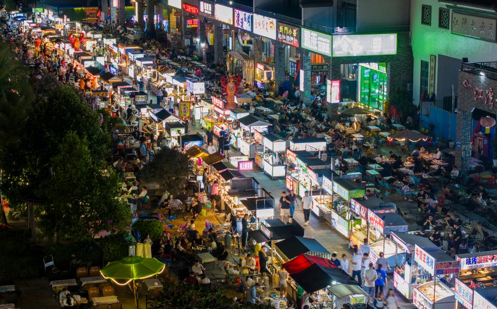 2025年10月19日,市民和游客在广西梧州市长洲区红岭街道水云天夜市品尝当地美食。(无人机照片)CICPHOTO/何华文摄