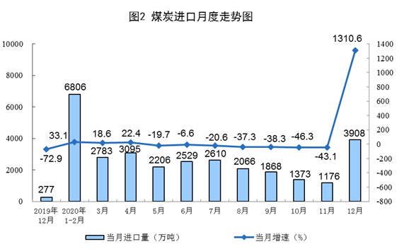 煤炭進(jìn)口增加。12月份,進(jìn)口煤炭3908萬噸,環(huán)比增加2732萬噸。2020年,進(jìn)口煤炭3.04億噸,比上年增長1.5%。