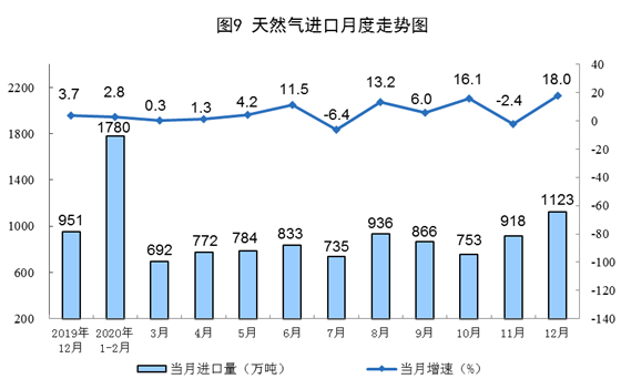 天然氣進(jìn)口由降轉(zhuǎn)增。12月份,進(jìn)口天然氣1123萬噸,同比增長18.0%,上月為下降2.4%。2020年,進(jìn)口天然氣1.02億噸,比上年增長5.3%。
