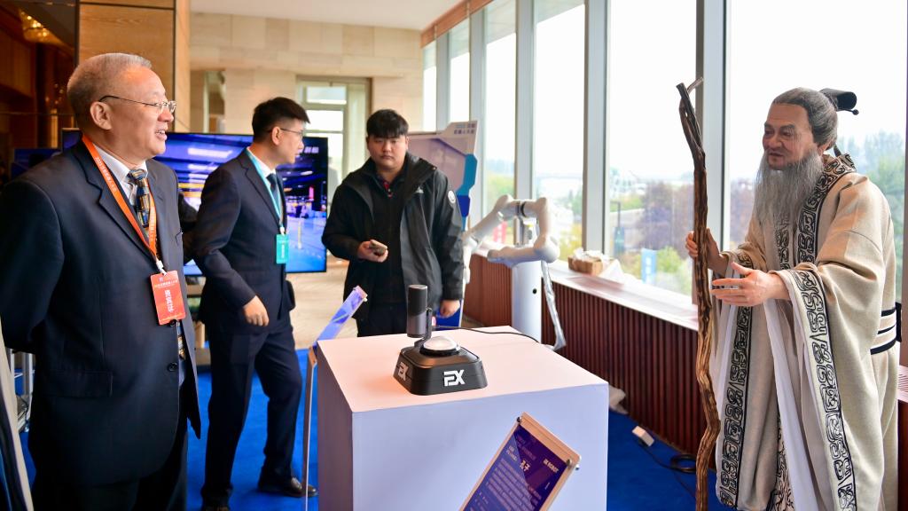 10月17日,一名参会嘉宾在沈阳新次元人形机器人研究院有限公司展台与交互型仿生人形机器人“孔子”互动。新华社记者 吴青昊 摄