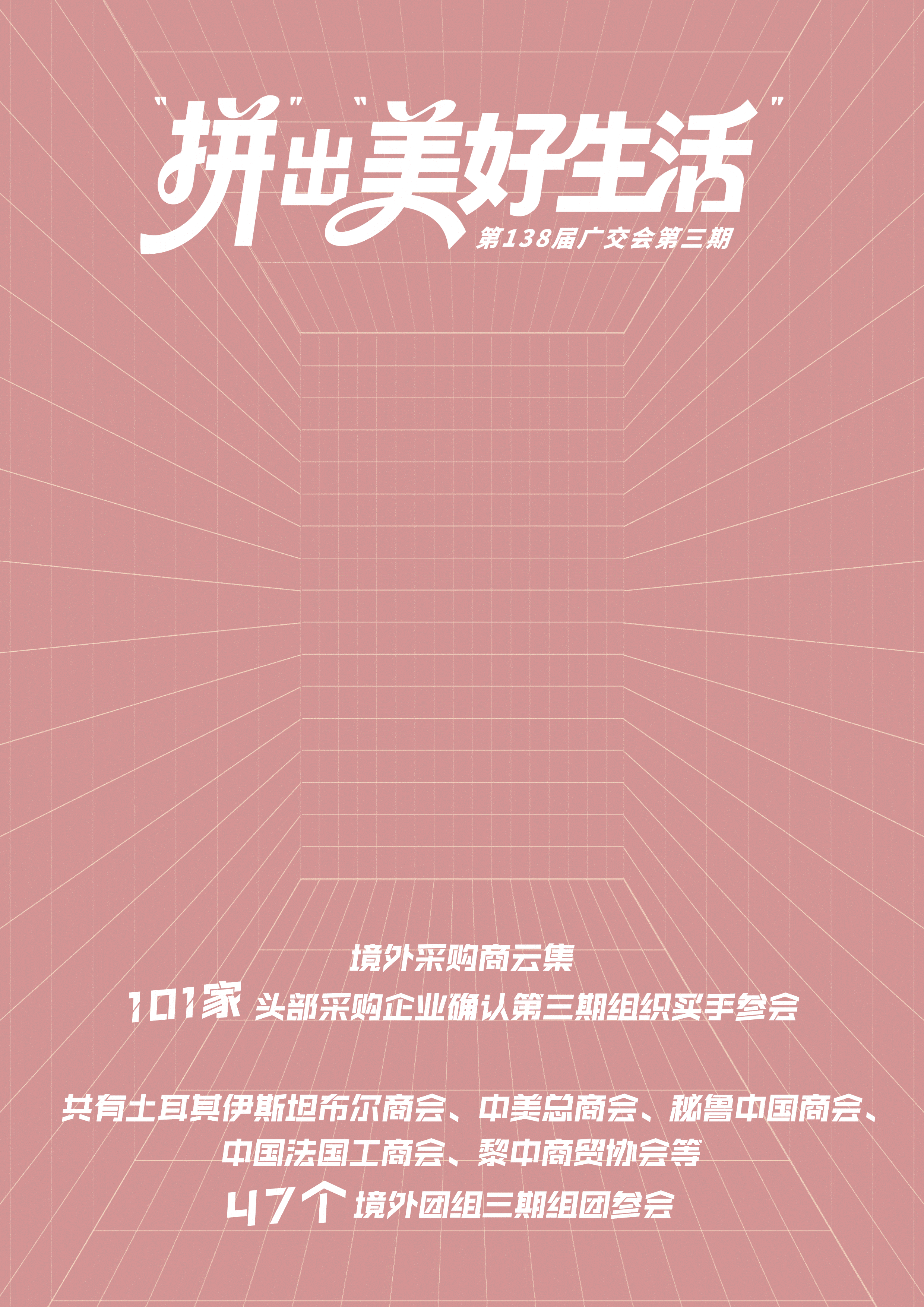 第138届广交会第三期以“美好生活”为主题,涵盖时尚、家用纺织品、玩具及孕婴童、文具、健康休闲五大板块,设立21个展区,展览面积达51.5万平方米,设展位约2.5万个,打造一场融合人文关怀与时尚潮流的全球贸易盛会。