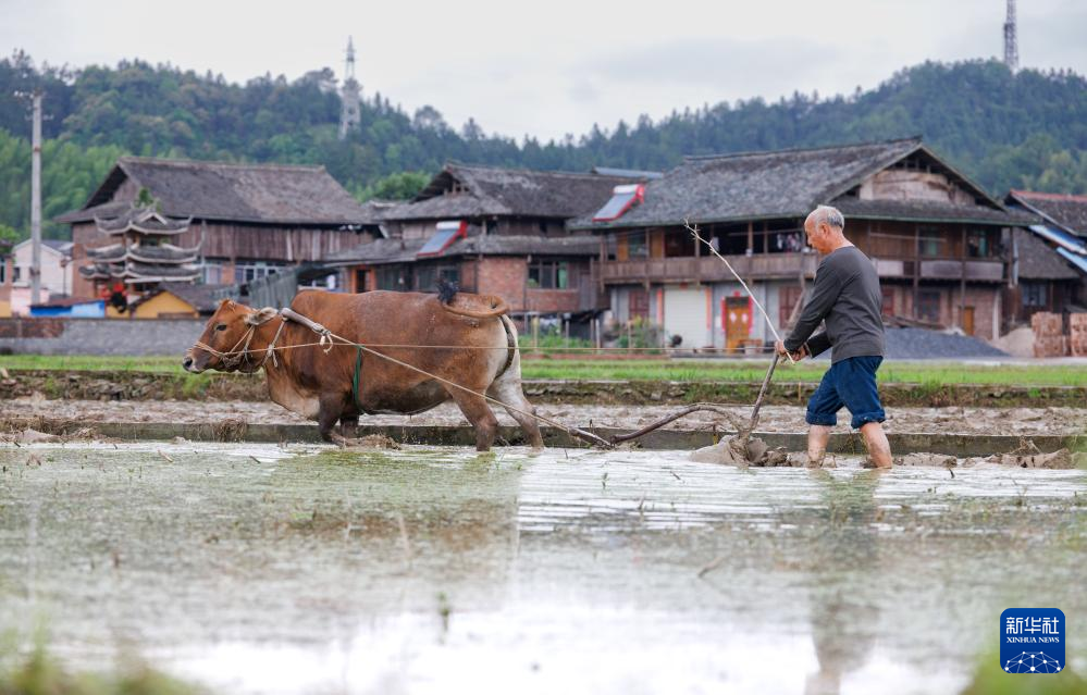 湖南省怀化市通道侗族自治县双江镇马龙村农民在田间耕作。新华社发(粟勇主摄)