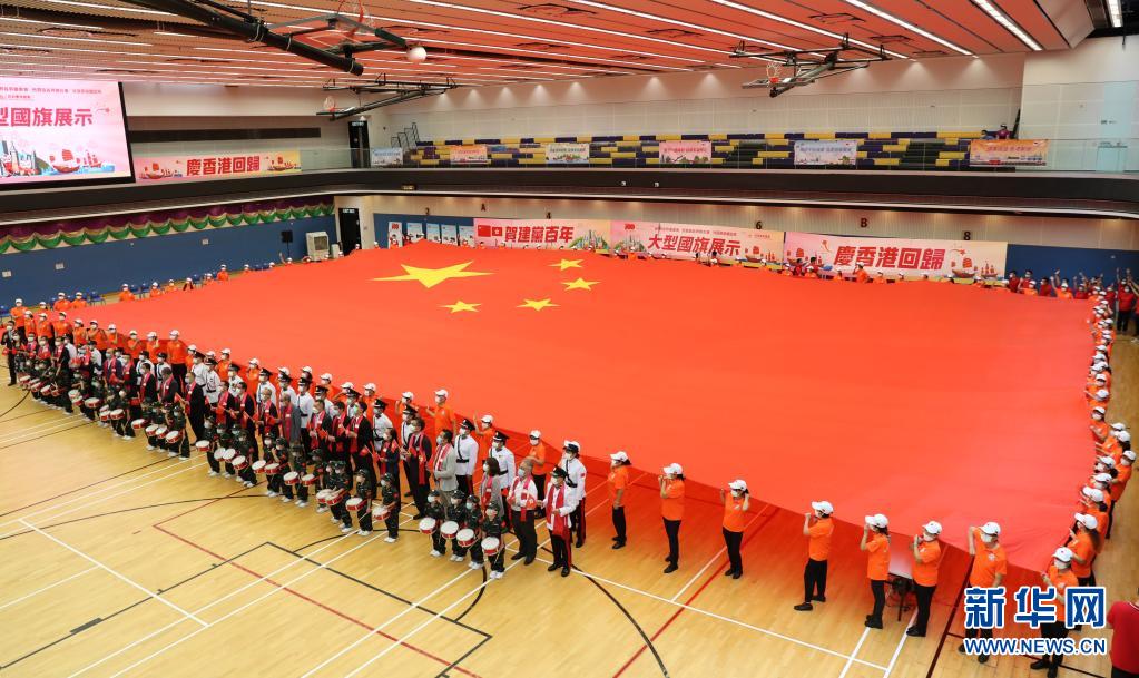 7月1日,在香港坑口體育館,香港市民展示大型國旗。新華社記者 李鋼 攝