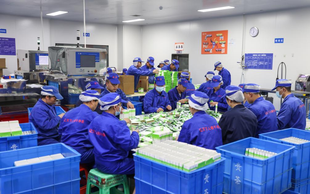 5月14日,工人在贵州省江口县贵茶产业园抹茶生产车间包装抹茶产品。