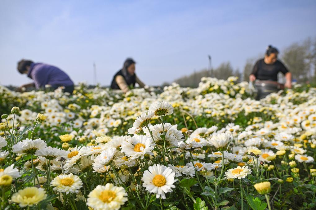 10月29日,河南省商丘市夏邑县王刘庄村村民在采摘菊花。