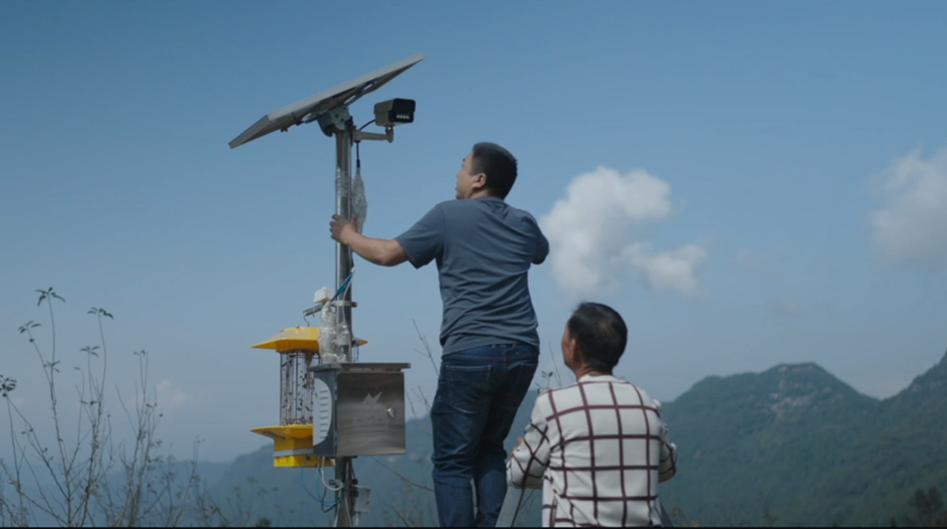 某农场负责人蔡青松和村民一起调整设备。(图片由海康威视提供)