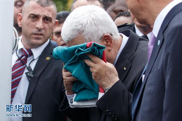 ????資料圖:在紐約聯合國總部,巴勒斯坦總統阿巴斯在升旗儀式上親吻巴勒斯坦國旗。新華社記者李木子攝