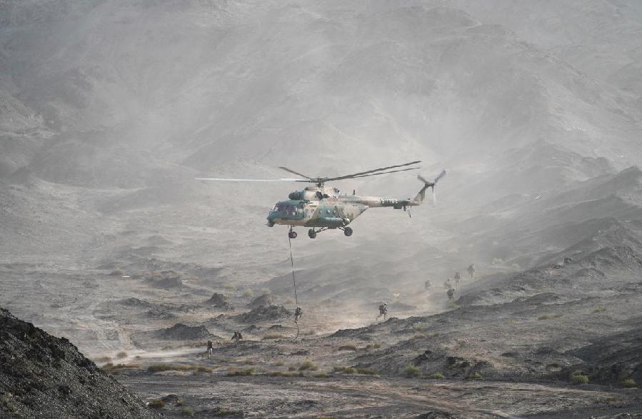 ????23日,陸軍新質作戰力量演練在陸軍多個演兵場連續“打響”,8支新質作戰力量輪番上陣。圖為特戰隊員在武裝直升機護衛下進行直升機懸吊撤離。新華社記者王東明 攝