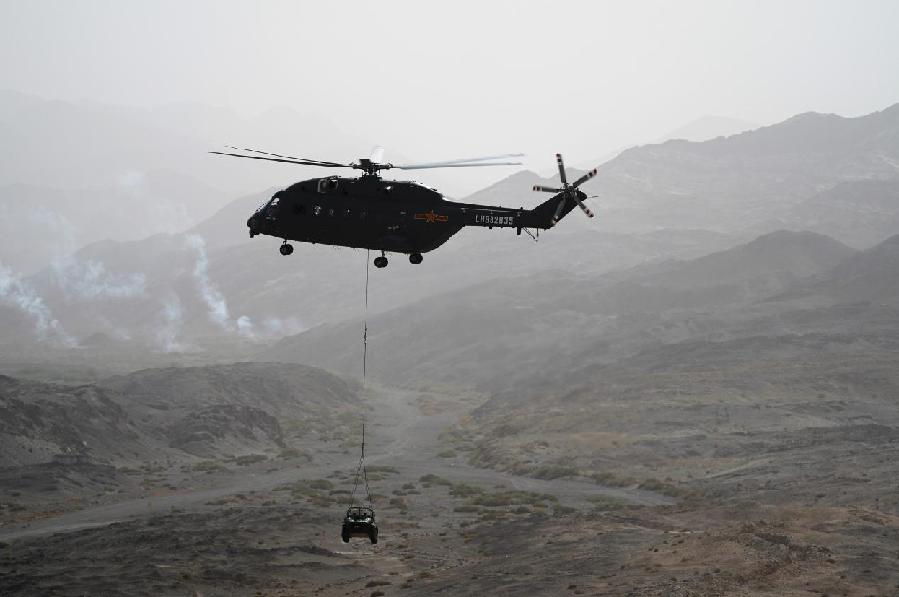 ????23日,陸軍新質作戰力量演練在陸軍多個演兵場連續“打響”,8支新質作戰力量輪番上陣。圖為運輸直升機吊運全地形車。新華社記者王東明 攝