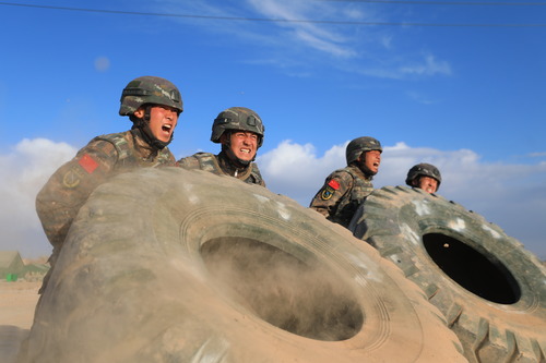 ????武警新疆總隊某機動支隊特戰一中隊組織官兵進行翻輪胎體能訓練(10月30日攝)。新華社發(張文 攝)