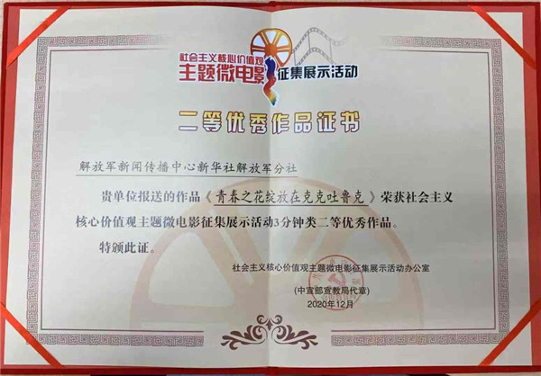 ????活動(dòng)自2020年5月開展以來,共收到社會(huì)各方面報(bào)送的作品4354部。征集工作結(jié)束后,由相關(guān)領(lǐng)域?qū)<覍W(xué)者組成的評(píng)審組對(duì)征集到的作品進(jìn)行評(píng)審,評(píng)選出優(yōu)秀作品134部、優(yōu)秀單項(xiàng)5個(gè)、優(yōu)秀組織單位12個(gè)。其中,由解放軍新聞傳播中心新華社解放軍分社申報(bào)的《青春之花綻放在克克吐魯克》獲“3分鐘類優(yōu)秀作品二等獎(jiǎng)”。