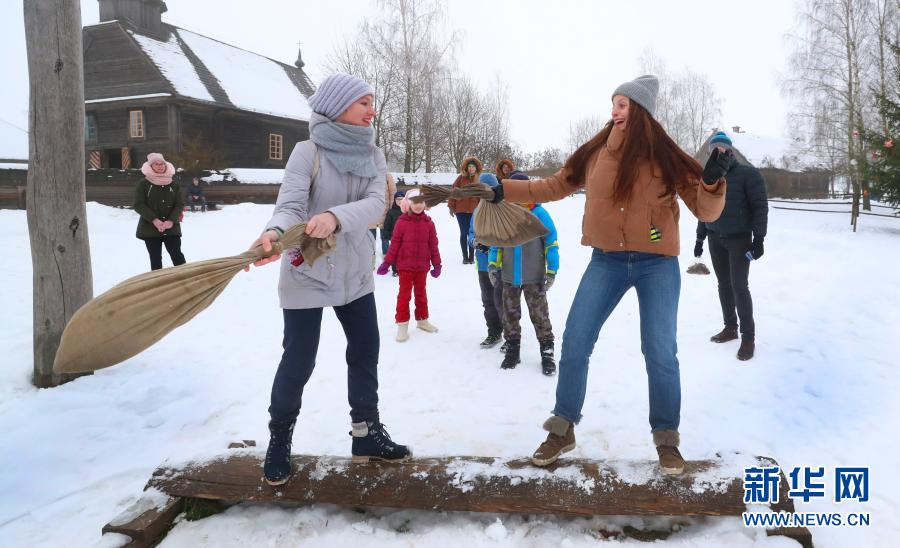 1月24日,年輕人在白俄羅斯首都明斯克郊區的民族建筑博物館參與傳統的冰雪游戲。新華社發(任科夫攝)