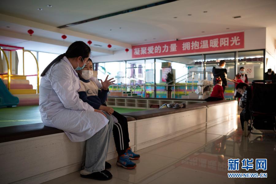 在哈爾濱博能中醫門診部,劉雨晴(左)和腦癱兒童交談(2月2日攝)。