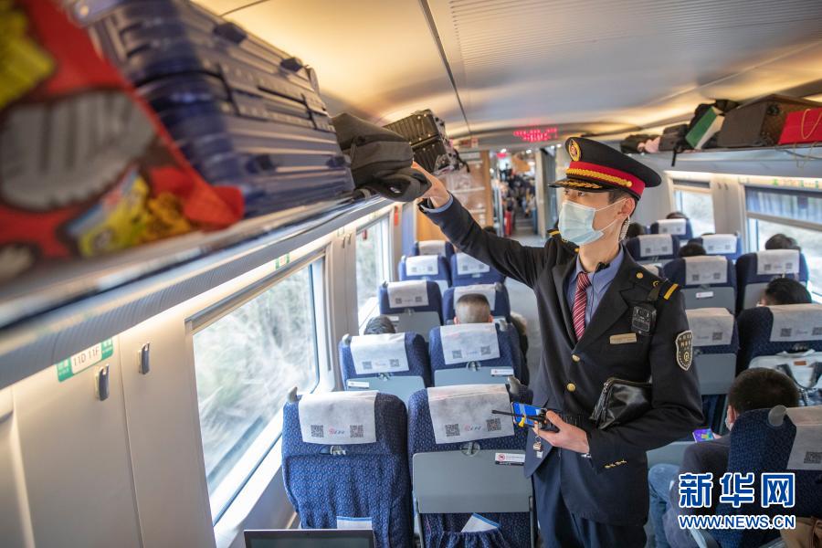 2月9日,在重慶北開往萬州北的C6422次列車上,付寶印在巡視車廂時為旅客調整行李架上的行李。新華社記者 黃偉 攝