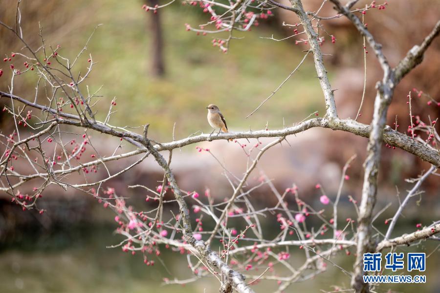 2月14日,在江蘇揚州瘦西湖湖畔,一只小鳥在梅枝上停歇。新華社發(齊立廣 攝)