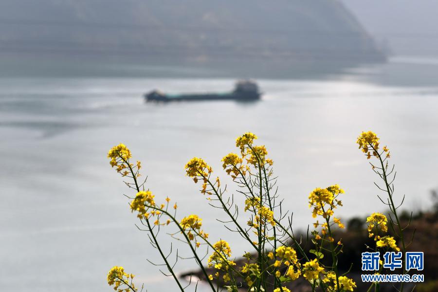 2月14日,貨輪行駛在長江湖北省秭歸縣江段,岸邊的油菜花吐露芬芳。新華社發(fā)(王輝富 攝)