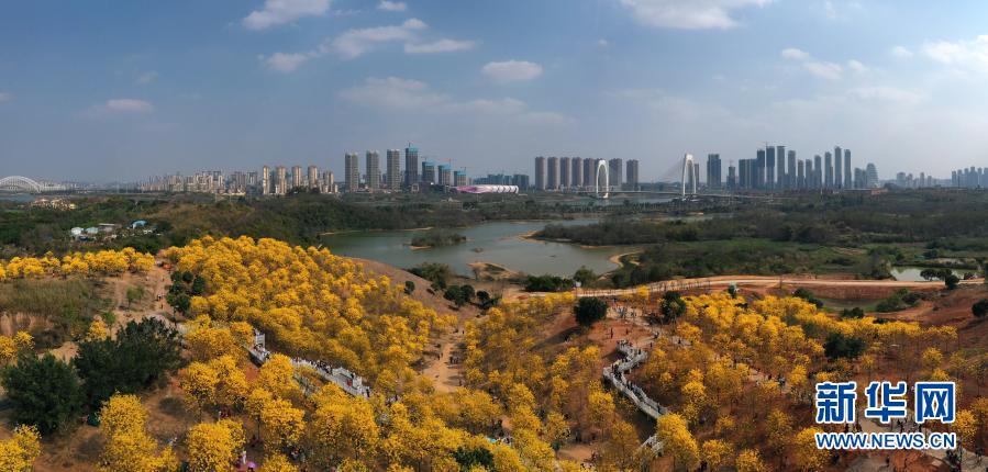 近日,廣西南寧市青秀山風景區黃花風鈴木盛放,吸引眾多游人前來觀賞。