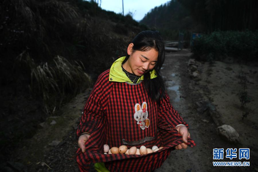 張志菊從自家農(nóng)場撿回雞蛋(2月25日攝)。