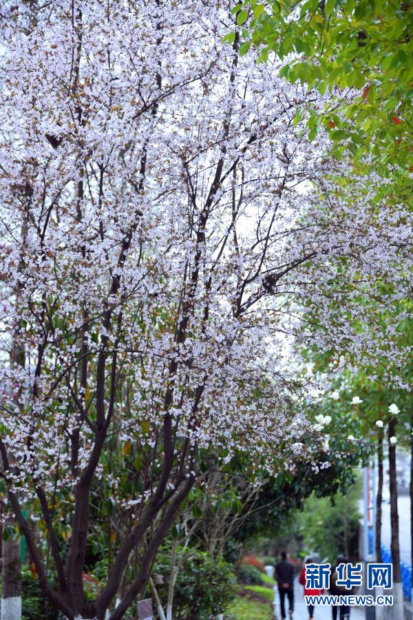 3月2日,市民走在湖北省恩施土家族苗族自治州宣恩縣貢水河畔的櫻花樹下。新華社發(王俊 攝)