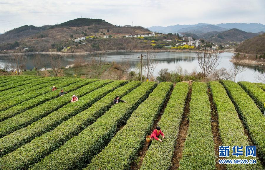 3月4日,茶農(nóng)在安康市漢濱區(qū)流水鎮(zhèn)剛子茶葉專(zhuān)業(yè)合作社標(biāo)準(zhǔn)化茶園采摘新茶(無(wú)人機(jī)照片)。新華社記者 陶明 攝