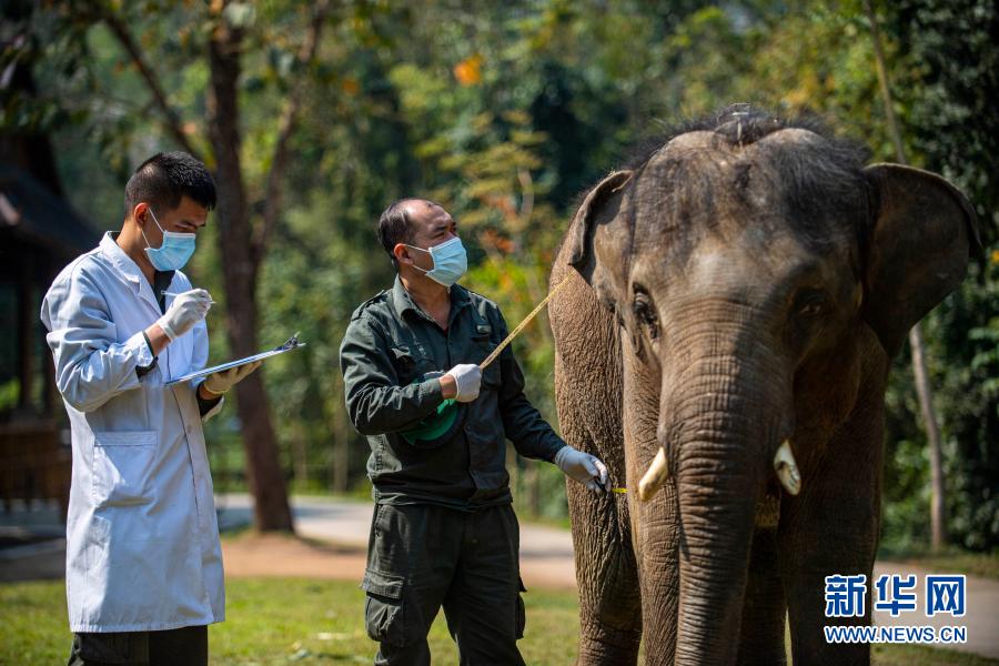 “象爸爸”為一頭名叫“小強(qiáng)”的大象測量胸圍(3月6日攝)。新華社記者 江文耀 攝