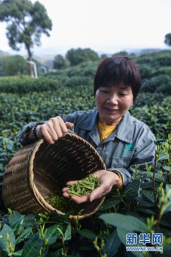 3月12日,在位于杭州市西湖風景名勝區滿覺隴村白鶴峰的西湖龍井茶葉基地,茶農展示剛剛采摘的西湖龍井茶鮮葉。