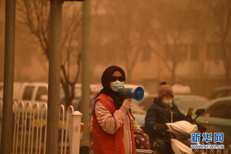 3月15日,在寧夏銀川市,志愿者在沙塵中引導市民出行。當日,我國北方多地出現沙塵天氣。新華社記者 唐如峰 攝