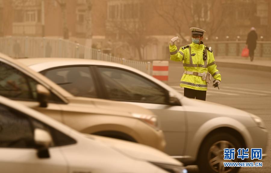 3月15日,交警在天津市南開區(qū)道路上執(zhí)勤。當日,我國北方多地出現(xiàn)沙塵天氣。新華社記者 李然 攝
