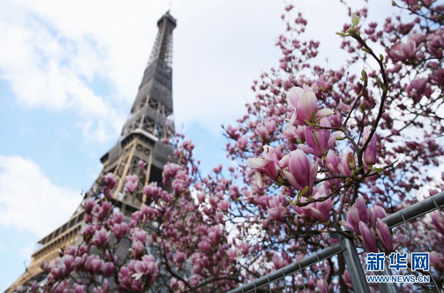 這是3月19日在法國巴黎埃菲爾鐵塔腳下的戰神廣場拍攝的盛放的玉蘭花。新華社記者高靜攝