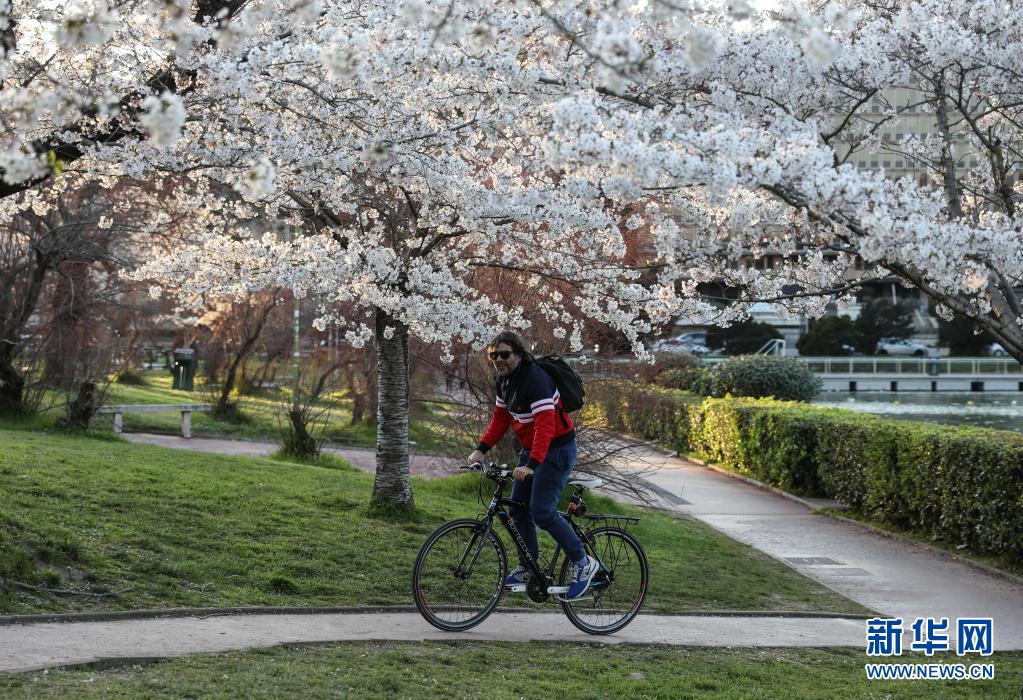 3月24日,市民騎車(chē)從意大利首都羅馬盛開(kāi)的櫻花樹(shù)下經(jīng)過(guò)。新華社記者 程婷婷 攝