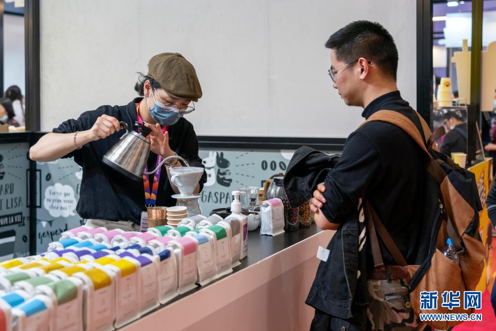 3月29日,參展商為顧客沖泡咖啡。