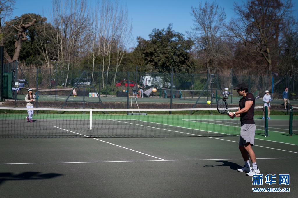 3月29日,人們在英國倫敦攝政公園的網球場打網球。
