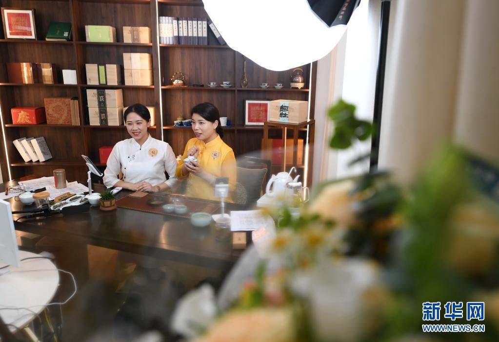 4月1日,主播在福鼎市一家茶企業(yè)直播間講解白茶和演示品飲技巧。新華社記者 林善傳 攝