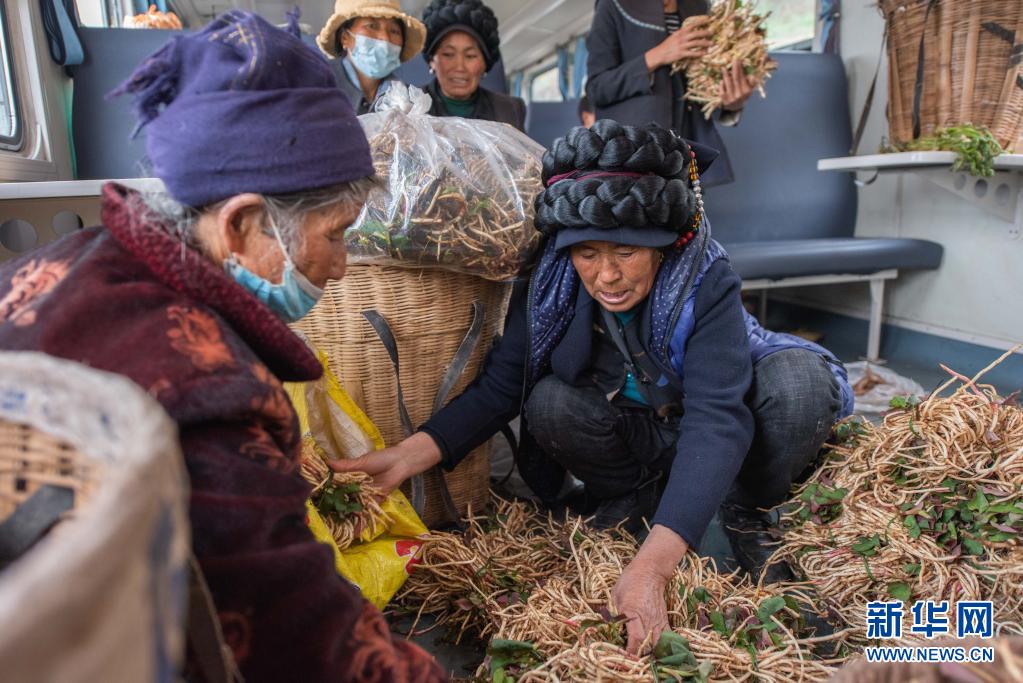 在5633次列車上的“流動集市”,一名彝族婦女(前右)在挑選折耳根(4月11日攝)。新華社記者 胥冰潔 攝