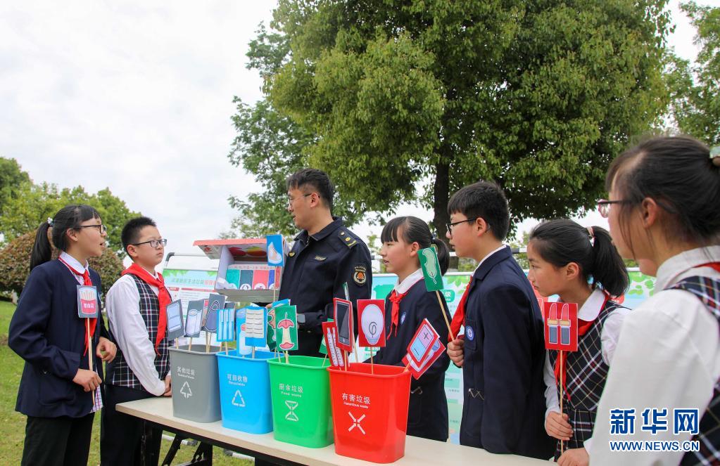 4月19日,工作人員向?qū)W生們講解垃圾分類、資源回收利用等常識。