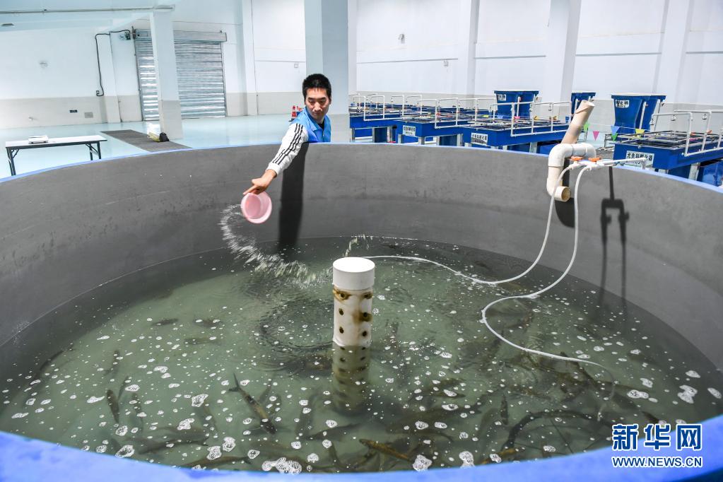 4月20日,大藤峽魚類增殖放流站的工作人員將配制好的營養液潑灑在苗種培育缸中。