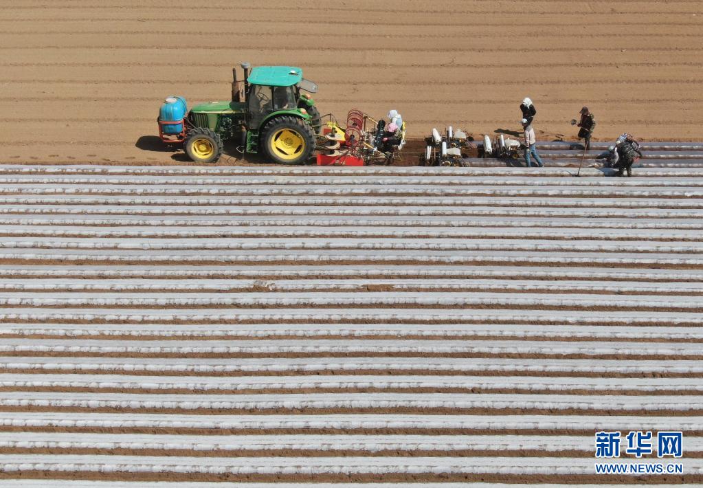 4月20日,工人操作機械設備在河北省張家口市塞北管理區農業基地為剛播種的胡蘿卜覆膜(無人機照片)。