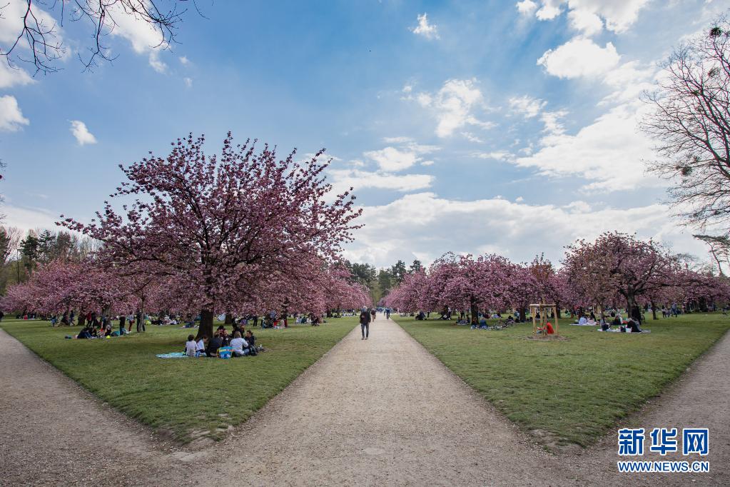 4月20日,人們在法國巴黎近郊的國璽公園欣賞櫻花。