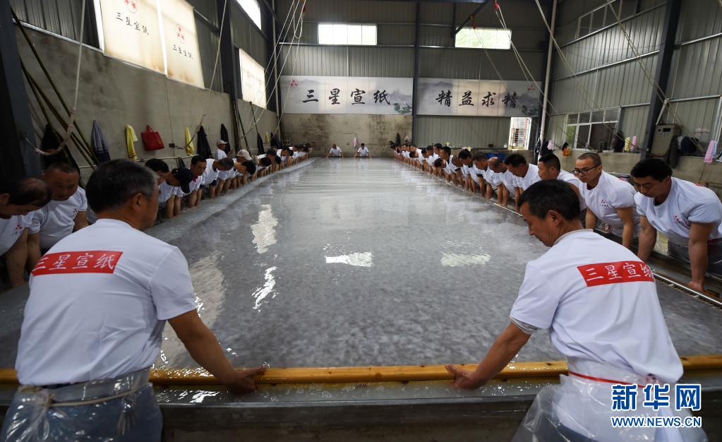 近日,在宣紙產(chǎn)地安徽省宣城市涇縣,“四丈宣紙”的抄制在一家紙業(yè)有限公司啟動(dòng)。50余名撈紙師傅操作巨型紙簾,齊心協(xié)力,在紙槽旁進(jìn)行撈紙作業(yè)。來回起落兩次,動(dòng)作整齊劃一。隨后工人們將紙簾吊起放至一邊揭下,一張巨大的宣紙便撈制成功。經(jīng)過曬、剪等工序后, 制成長(zhǎng)13.2米、寬3.6米的巨型宣紙就是“四丈宣紙”。