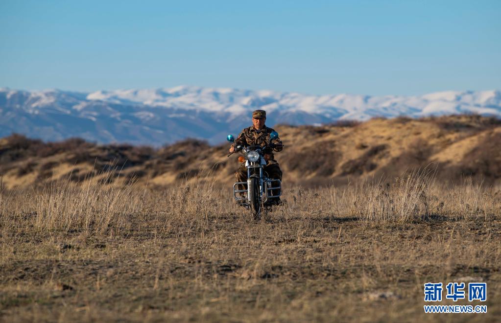 新疆生產建設兵團第10師185團職工馬軍武騎摩托行駛在管護轄區內(4月9日攝)。