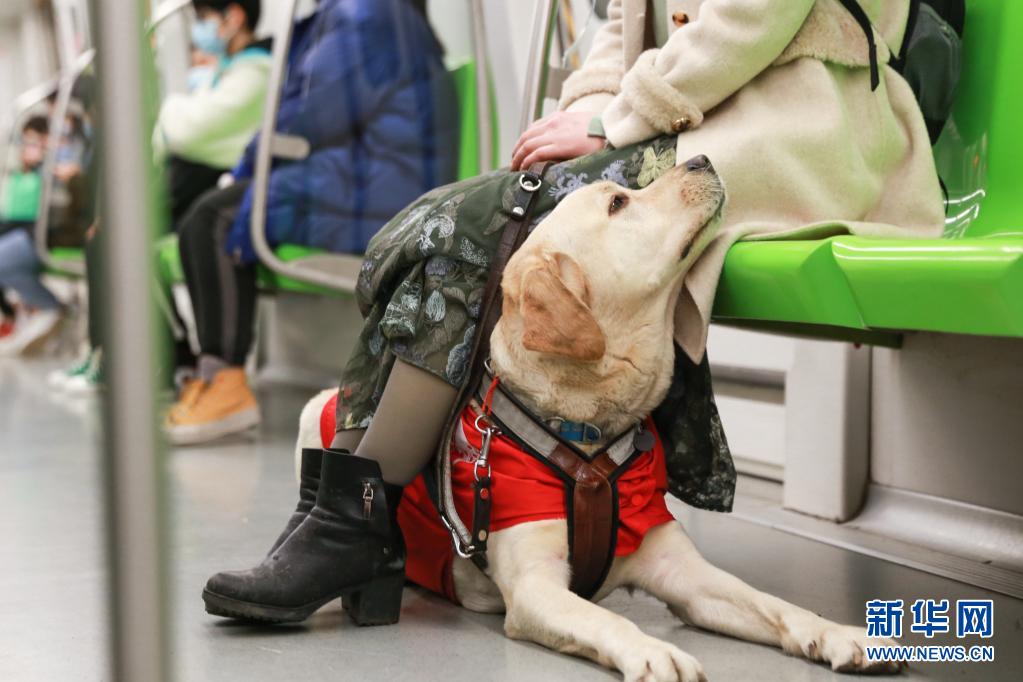 導盲犬“Bingo”陪伴李靜乘坐地鐵(3月27日攝)。 新華社發 (張夢 攝)