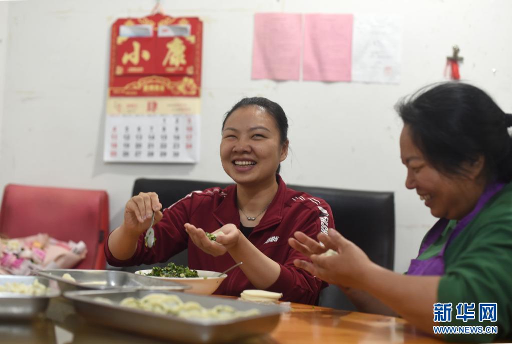 4月28日,葉景芬(左)和媽媽林鳳玉在家中包餃子。新華社記者 韓傳號(hào) 攝