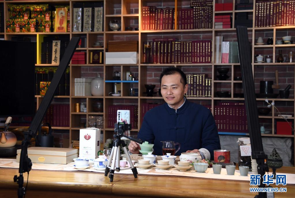 李卓澄在“小茶館”中通過視頻直播的方式向觀眾介紹茶知識(shí)(4月29日攝)。新華社記者 趙婷婷 攝