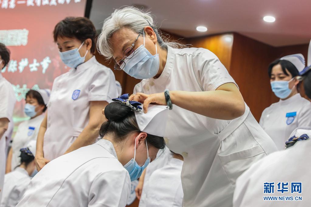 5月10日,北京大學人民醫院的護理屆前輩閆鳳玲(中)為新入職護士授帽。