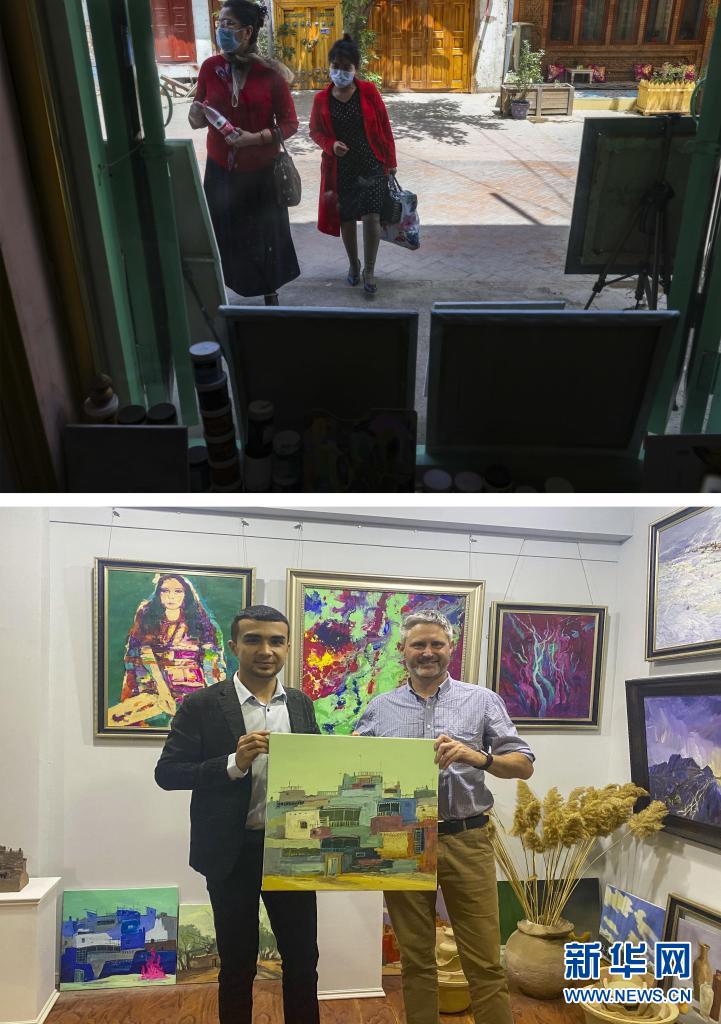 拼版照片:上圖為兩名行人在麥麥提吐爾遜江的工作室外觀看畫作(5月8日,新華社記者胡虎虎攝);下圖為“五一”期間,一名來自烏克蘭的游客(右)購買畫作后與麥麥提吐爾遜江合影(受訪者供圖)。新華社發