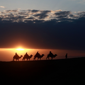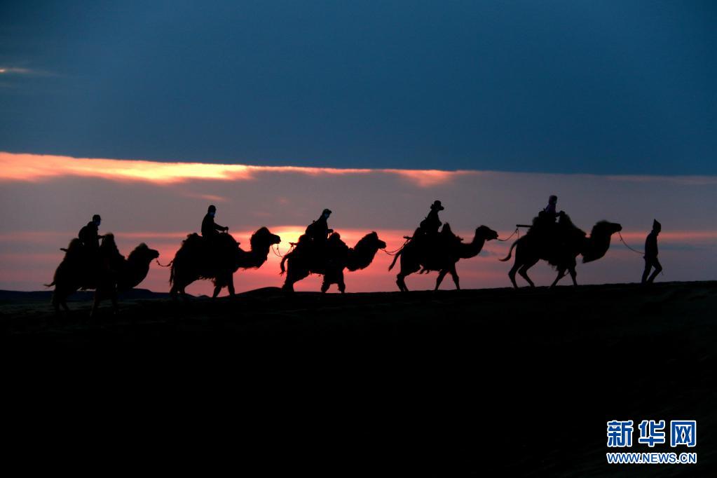 5月15日,游客騎駱駝在甘肅省敦煌市鳴沙山月牙泉景區游覽。晨光下,云彩、沙山、駝隊構成了一幅美麗迷人的畫卷。新華社發(張曉亮 攝)