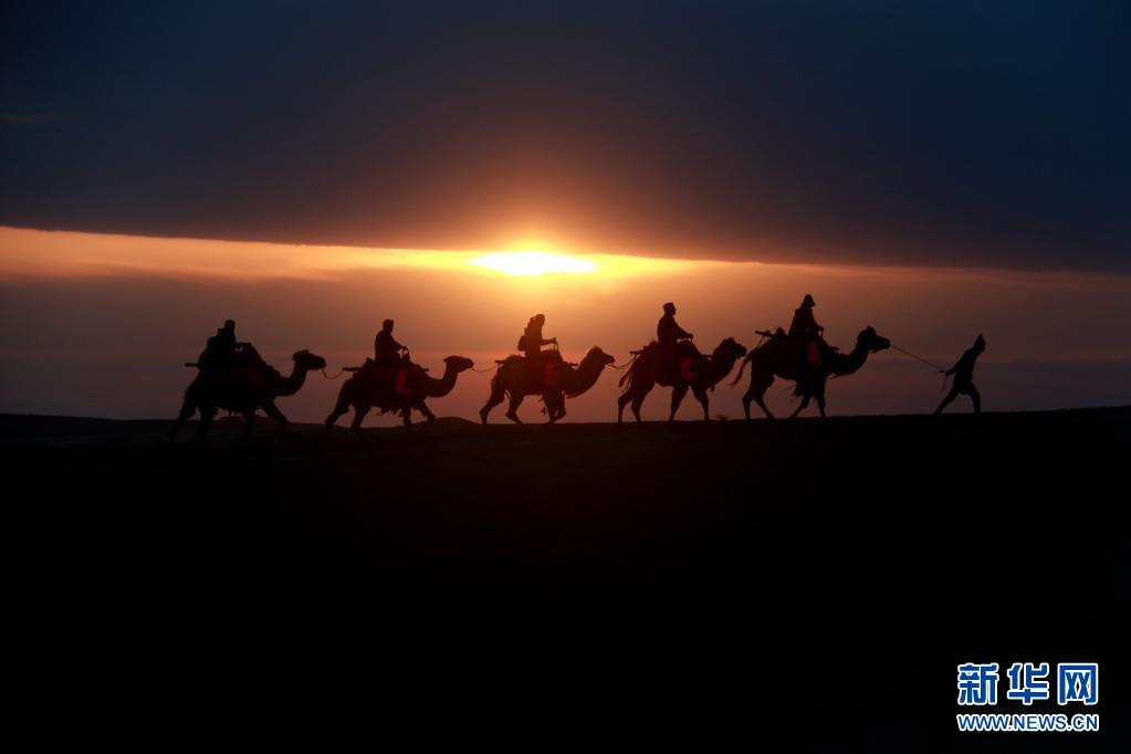 5月15日,游客騎駱駝在甘肅省敦煌市鳴沙山月牙泉景區游覽。晨光下,云彩、沙山、駝隊構成了一幅美麗迷人的畫卷。新華社發(張曉亮 攝)