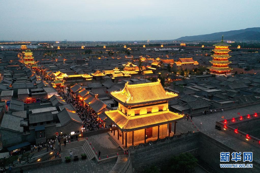 夜幕降臨,位于山西省太原市晉源區的太原古縣城流光溢彩,游人如織。太原古縣城始建于明代,占地面積約0.8平方公里,因其造型像一只飛鳥,也被譽為“鳳凰城”。歷經8年修繕后,太原古縣城于2021年5月重新對外開放。