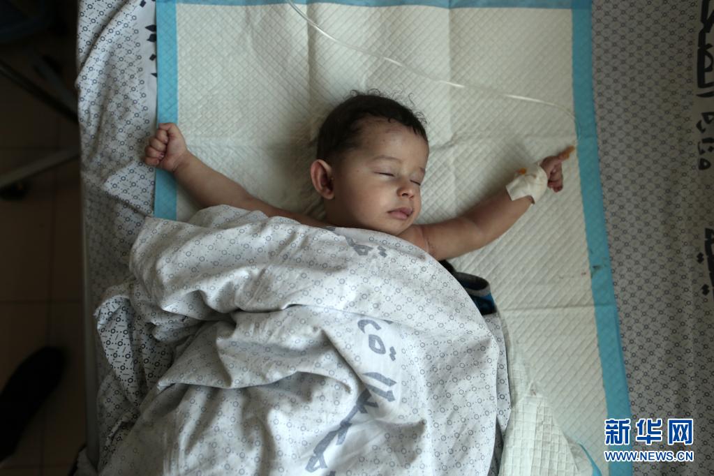 5月20日,一名因空襲受傷的巴勒斯坦兒童在加沙地帶城市汗尤尼斯的醫院中接受治療。