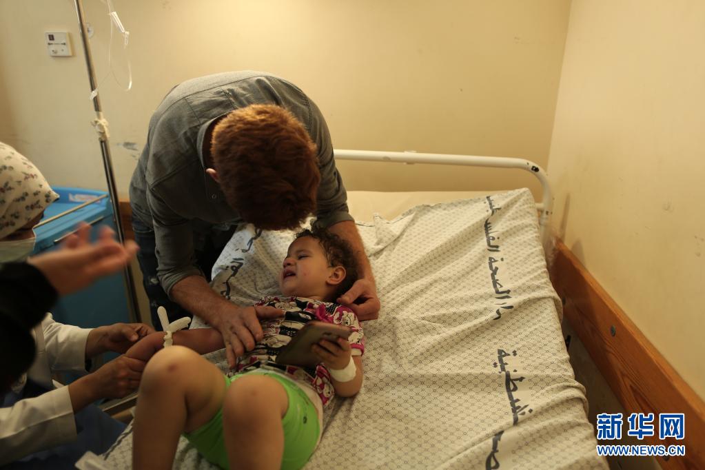 5月20日,一名因空襲受傷的巴勒斯坦兒童在加沙地帶城市汗尤尼斯的醫院中接受治療。